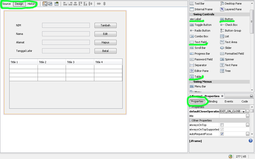 8. Tambahkan 4 buah tombol(jButton), 4 buah textbox(jTextField), 4 buah label(jLabel) dan 1 buah Tabel(jTable) yang ada di palette swing controls.